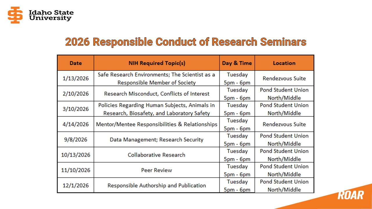 The Office for Research has designed the seminars below to comply with training requirements for researchers funded by a grant from the NIH, NSF, or USDA. Principal Investigators, graduate students, and undergraduates students are welcome.
